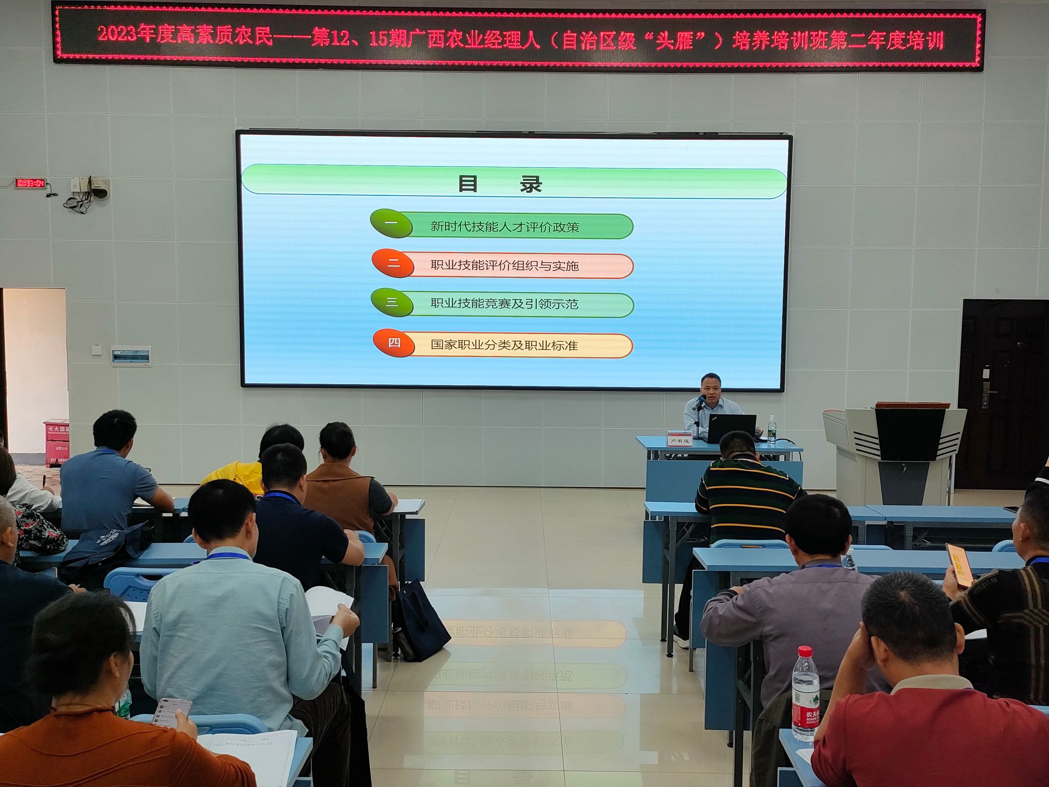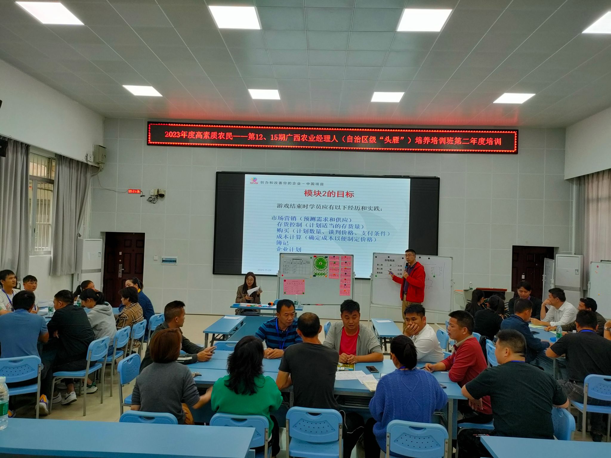 本年度的培训围绕农业经理人必备职业素养,开设有关农业企业财务管理、经营管理、生产管理、市场营销、商务活动策划与组织、文旅融合发展等课程。此外,还安排了模拟经营实训课程,采用小班教学的方式,每班安排至少2位指导老师,带领学员们开展模拟经营实训,指导学员们学以致用,将学习的理论知识运用于实训实践。同时,为了开展好农业经理人国家职业技能等级认定工作,特别邀请到自治区职业技能鉴定中心卢有连主任,为学员们讲解国家和我区有关职业技能等级认定工作政策,开展考核认定辅导。