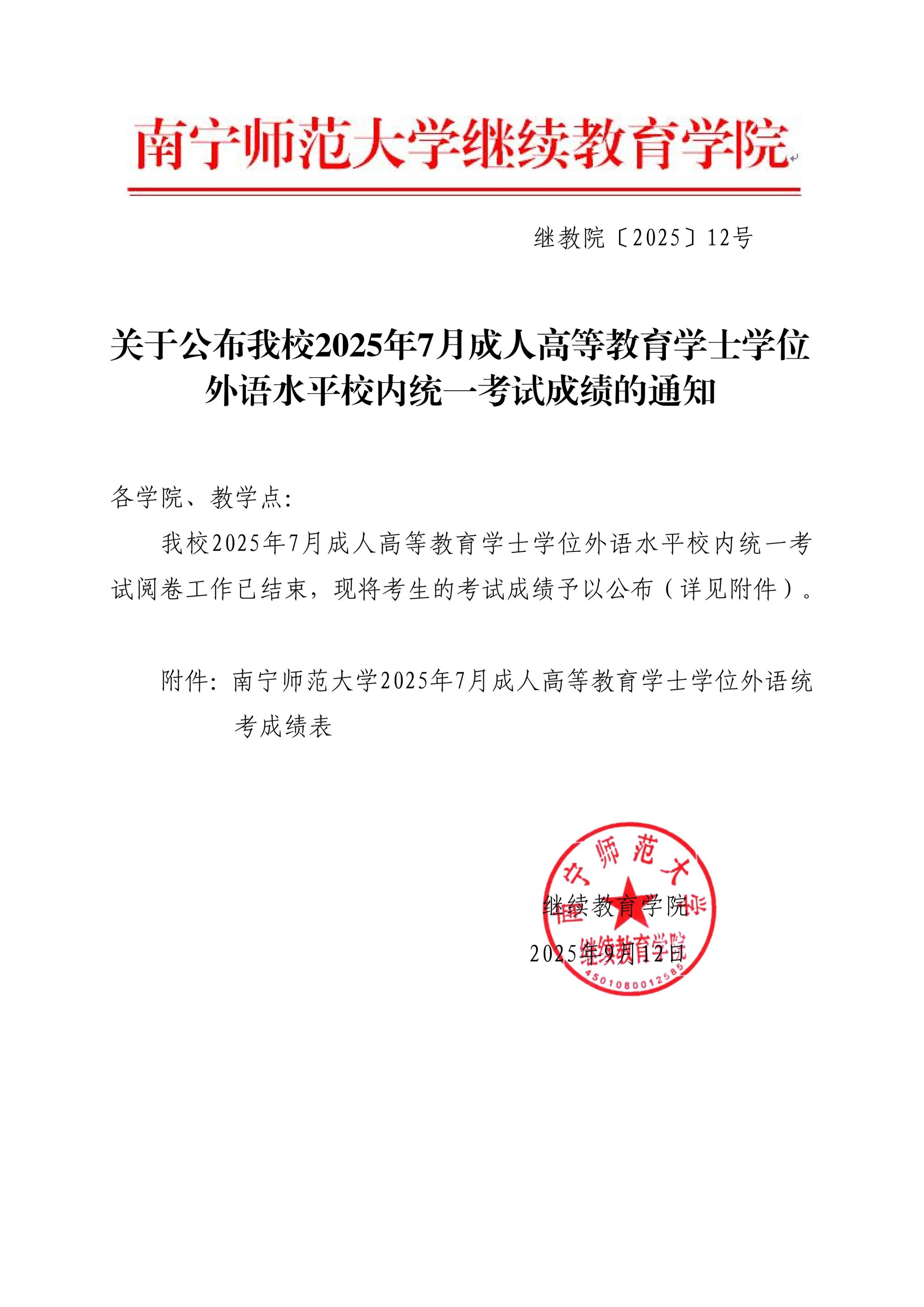 关于公布我校2025年7月成人高等教育学士学位外语水平校内统一考试成绩的通知